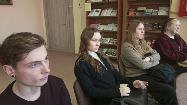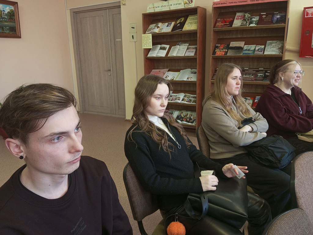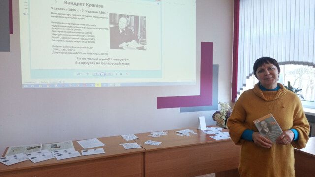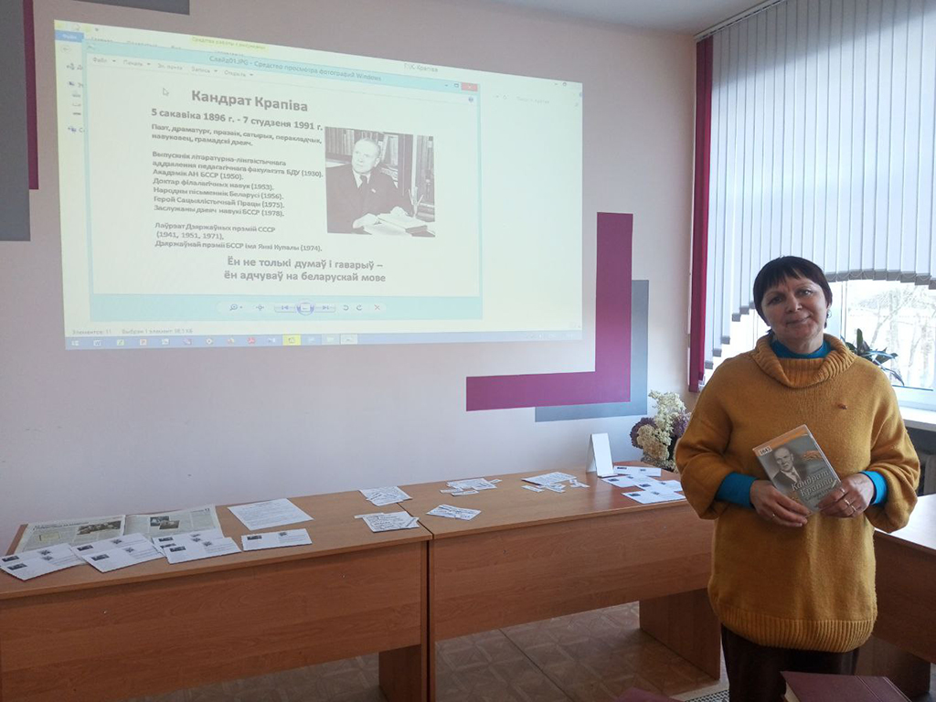 Вядучы бібліятэкар Кавалеўская Ларыса Алегаўна расказвае пра жыццё і пісьменніцкую працу Кандрата Крапівы студэнтам 2 курса факультэта ветэрынарнай медыцыны, з куратарам Спірыдонавай Наталляй Віктараўнай, дацэнтам кафедры паталагічнай анатоміі і гісталогіі.