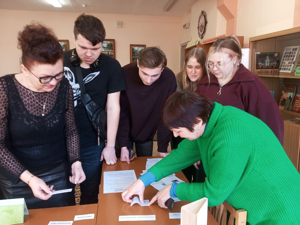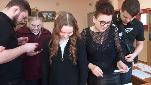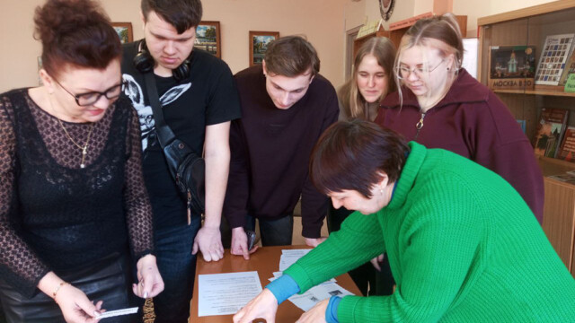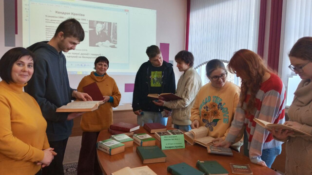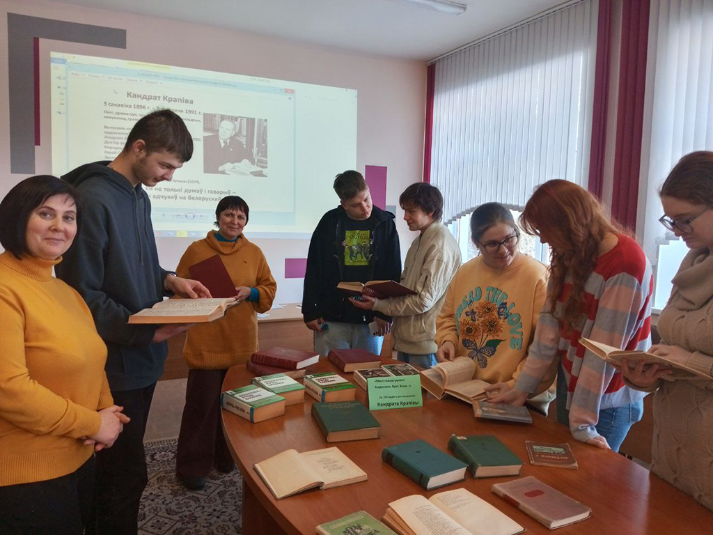Студэнты 2 курса факультэта ветэрынарнай медыцыны і іх куратар Сельмановіч Ларыса Аркадзьеўна, дацэнт кафедры анатоміі, ў бібліятэцы на мерапрыемстве да юбілею Кандрата Крапівы.